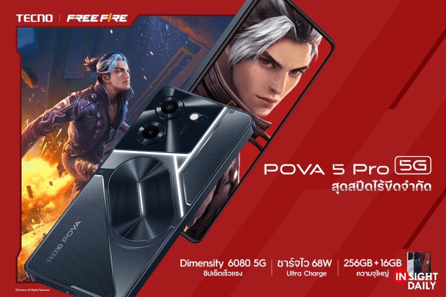เทคโน ประเทศไทย เปิดตัว POVA 5 Pro สมารต์โฟนสเปกเกมมิ่งรุ่นใหม่ล่าสุดใน POVA Series อัปเกรดประสิทธิภาพการระบายความร้อนเต็มระบบ สปีดขั้นสุดทุกสเปกด้วยชิปเซ็ต Dimensity 6080 5G ชารจ์ไว 68W Ultra Charge หน้าจอแสดงผล 120Hz วางจำหน่ายอย่างเป็นทางการแล้ววันนี้ พร้อมเขย่าราคาตลาดสมารต์ โฟน 5G ในราคาเริ่มต้น 6,699 บาท