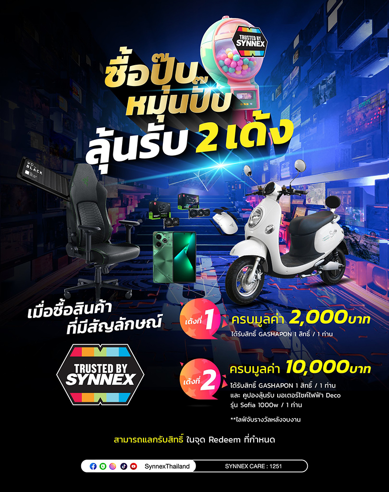 แคมเปญแรก “ซื้อปุ๊บ หมุนปั๊บ ลุ้นรับ 2 เด้ง” เพียงซื้อสินค้าที่มี สติ๊กเกอร์ Trusted by Synnex ภายในงานฯ มียอดซื้อ 2,000 บาทขึ้นไป รับสิทธิ์หมุน กาชาปอง 1 สิทธิ์/บิล ที่จุดจัดกิจกรรมพิเศษของซินเน็คฯ เพื่อลุ้นรับของรางวัลใหญ่ อาทิ การ์ดจอ GeForce RTX 4090 หรือรางวัลอื่น ๆ อีกมากมาย! และหากยอดซื้อ 10,000 บาทขึ้นไป ยังจะได้รับสิทธิ์ลุ้นรางวัลเพิ่มเติมกับ รถมอเตอร์ไซค์ไฟฟ้า Deco Sofia 1000w โดยการจับรางวัลจะมีขึ้นผ่านไลฟ์สดหลังจบงาน โดยสามารถติดตามรายละเอียดได้ที่แฟนเพจเฟสบุ๊ค Synnex Thailand