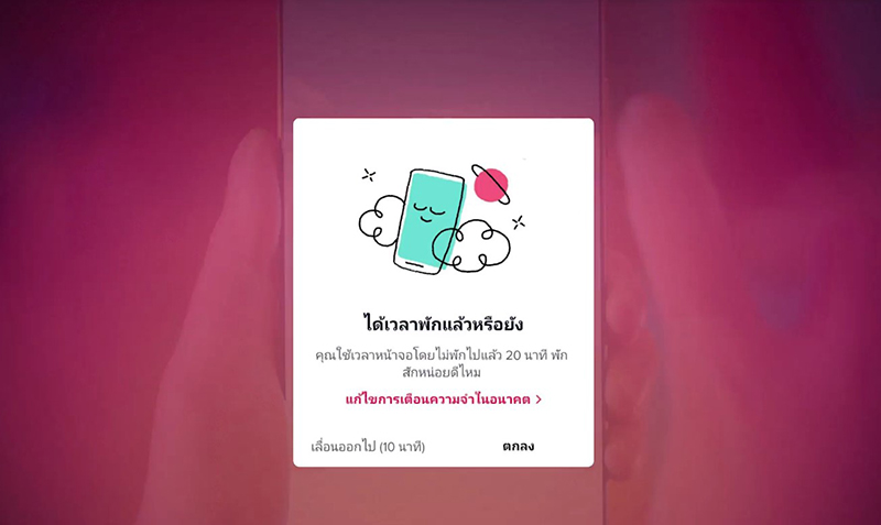 - กำหนดเวลาหน้าจอประจำวันที่เหมาะสม (Daily screen time): สุขภาวะที่ดีสามารถเริ่มต้นจากการตั้งค่าเวลาหน้าจอประจำวัน จะมีการแจ้งเตือนเมื่อถึงเวลาที่ถูกตั้งค่าไว้บน TikTok การจำกัดเวลาหน้าจอนั้นส่งผลดีต่อสุขภาพในระยะยาว และสำหรับผู้ปกครองสามารถกำหนดเวลาหน้าจอประจำวันของบุตรหลานในแต่ละวันได้โดยตรง หากมีการตั้งค่าการควบคุมโดยผู้ปกครองไว้