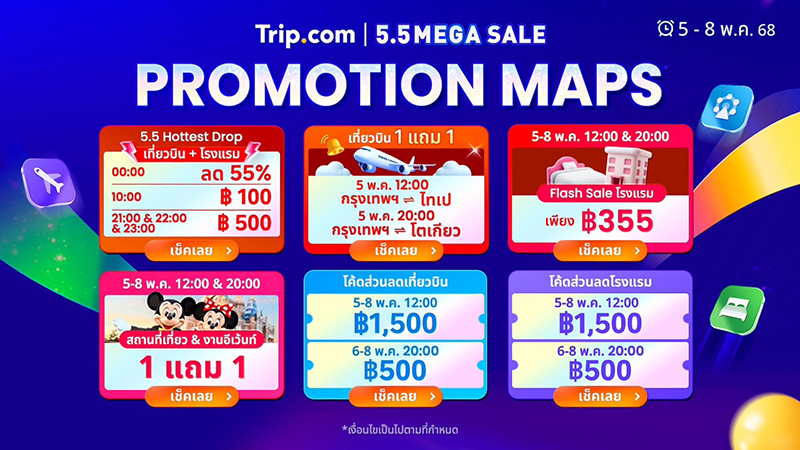 Trip.com จัดหนักโปรโมชัน 5.5 Mega Sale เตรียมจองโรงแรมคืนละ 355 บาท พร้อมดีลตั๋วเครื่องบินซื้อ 1 แถม 1*