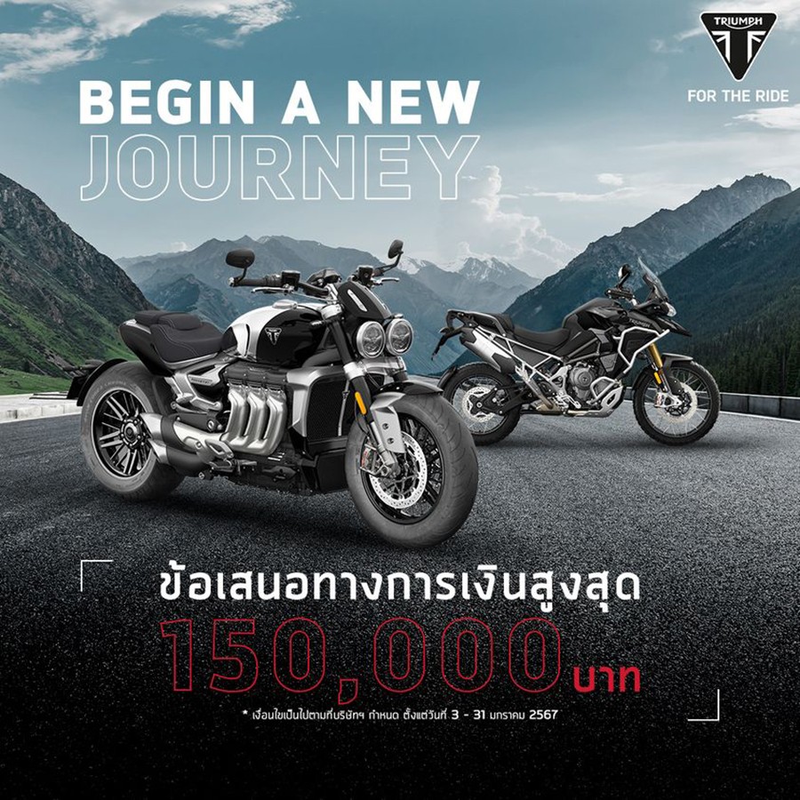 “ไทรอัมพ์ มอเตอร์ไซเคิลส์” (Triumph Motorcycles) ชวนเปิดประสบการณ์การขับขี่ และการผจญภัยครั้งใหม่รับปีมังกรด้วยโปรโมชันข้อเสนอทางการเงินสุดพิเศษ สำหรับรถจักรยานยนต์รุ่นที่ร่วมรายการ โดยในกลุ่มเซกเมนต์ Classics คลาสสิก รับข้อเสนอทางการเงินสูงสุด 40,000 บาท กลุ่มเซกเมนต์ Roadsters และ Rocket 3 รับข้อเสนอทางการเงินสูงสุด 100,000 บาท และกลุ่มเซกเมนต์ Adventure รับข้อเสนอทางการเงินสูงสุด 150,000 บาท