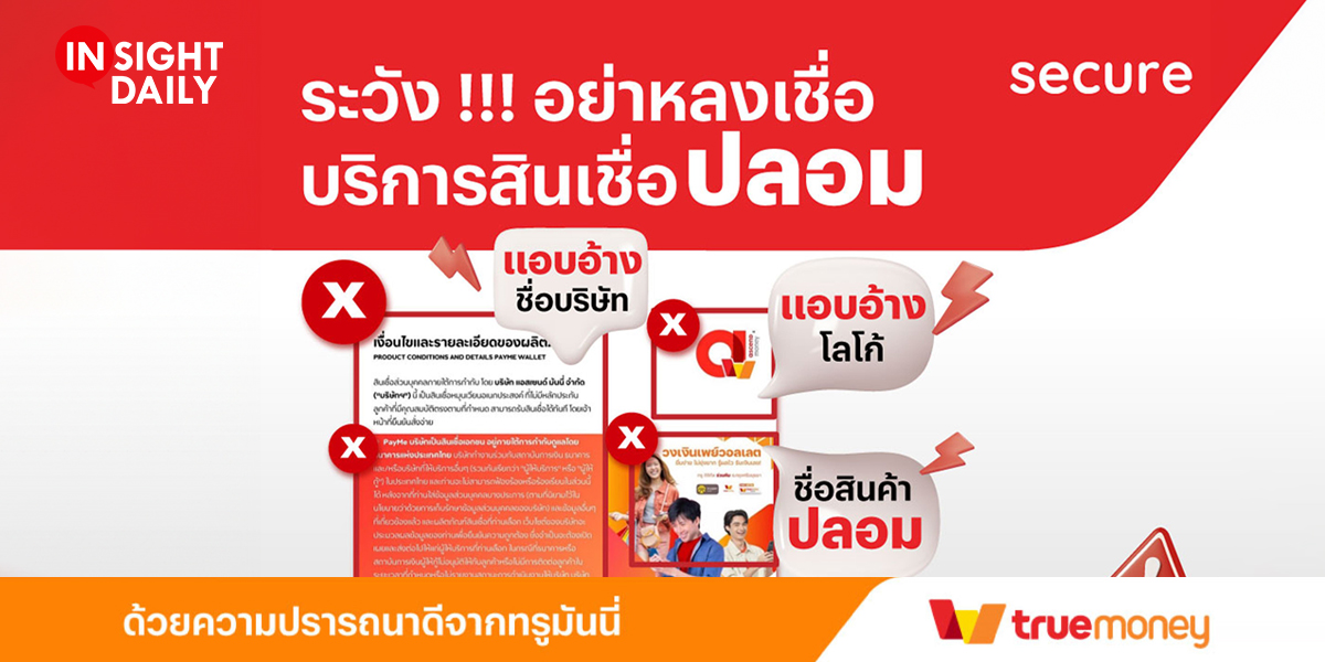 ทรูมันนี่ (TrueMoney) และ แอสเซนด์ นาโน (Ascend Nano) เตือนภัยประชาชนให้ระวังมิจฉาชีพแอบอ้างชื่อบริษัทฯ โลโก้ หรือชื่อสินค้าและบริการต่าง ๆ เพื่อหลอกลวงให้ประชาชนสมัครบริการสินเชื่อปลอม