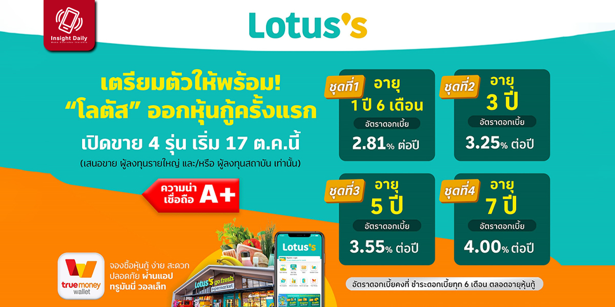 ทั้งนี้ หุ้นกู้โลตัสที่จะเสนอขายให้แก่ผู้ลงทุนรายใหญ่ และ/หรือ ผู้ลงทุนสถาบัน ในระหว่างวันที่ 17-19 ตุลาคม 2565 มีขั้นต่ำในการจองซื้อ 100,000 บาท และทวีคูณครั้งละ 100,000 บาท โดยชำระดอกเบี้ยทุก 6 เดือน แบ่งเป็น 4 รุ่นดังนี้