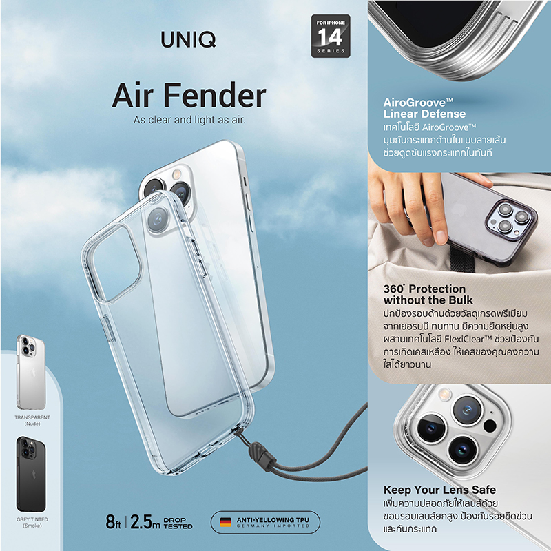 - รุ่น AIR FENDER เคสใสที่มาพร้อมความเพรียวบางและเบาดุจอากาศ เสริมการปกป้องด้วยเทคโนโลยี AiroGroove™ ซึ่งเป็นการออกแบบมุมกันกระแทกด้านในแบบลายเส้นเพื่อช่วยดูดซับแรงกระแทกในทันที ผ่านการทดสอบว่าสามารถรองรับแรงกระแทกจากการตกจากที่สูงได้ถึง 8 ฟุต (2.5 เมตร) ผลิตด้วยวัสดุ TPU คุณภาพสูงจากเยอรมนี ทำให้ตัวเคสมีความทนทานและยืดหยุ่นสูง สามารถบิดงอได้ โดยไม่เสียรูปทรง ผสานเทคโนโลยี FlexiClear™ ซึ่งมีคุณสมบัติป้องกันการเกิดเคสเหลือง UNIQ รุ่น AIR FENDER มี 2 สี ได้แก่ สี TRANSPARENT (Nude) และสี GREY TINTED (Smoke) วางจำหน่ายในราคา 690 บาท