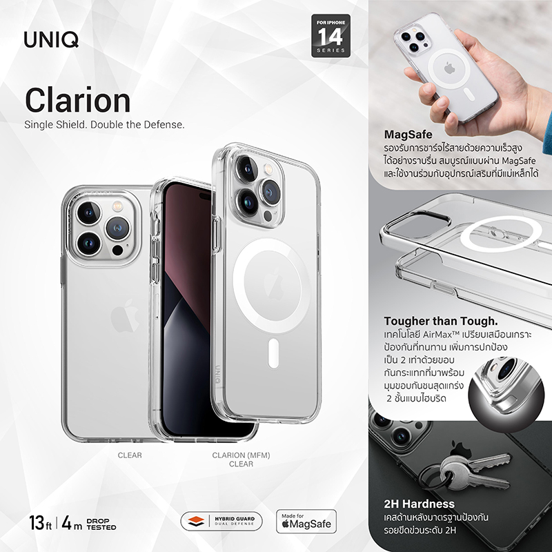 - รุ่น CLARION และ รุ่น CLARION (MFM) เคสใสที่มาพร้อมเทคโนโลยี AirMax™ ที่เปรียบเสมือนเกราะป้องกันที่ทนทาน เพิ่มการปกป้องเป็น 2 เท่าด้วยขอบกันกระแทกที่มาพร้อมมุมขอบกันชนสุดแกร่ง 2 ชั้นแบบไฮบริด ตัวเคสผลิตจากวัสดุ TPU และเคสด้านหลังผลิตจากวัสดุ PC มาตรฐานป้องกันรอยขีดข่วนระดับ 2H เคลือบสารป้องกันยูวีและการเกิดเคสเหลืองได้อย่างดีเยี่ยม ผ่านการทดสอบว่าสามารถรองรับแรงกระแทกจากการตกจากที่สูงได้ถึง 13 ฟุต (4 เมตร) เคสรุ่น CLARION (MFM) ได้รับมาตรฐาน MFM (Made for MagSafe ) จาก Apple เพื่อมอบประสบการณ์การใช้งานที่ราบรื่นสำหรับการชาร์จไร้สายผ่าน MagSafe ช่วยให้คุณชาร์จไอโฟนได้ด้วยความเร็วสูง และยังสามารถใช้งานร่วมกับอุปกรณ์เสริมอื่นๆที่มีส่วนประกอบของแม่เหล็กได้ UNIQ รุ่น CLARION มี 1 สี คือ สี CLEAR (Lucent) วางจำหน่ายในราคา 890 บาท และรุ่น CLARION (MFM) มี 1 สี คือ สี CLEAR (Lucent) วางจำหน่ายในราคา 1,390 บาท