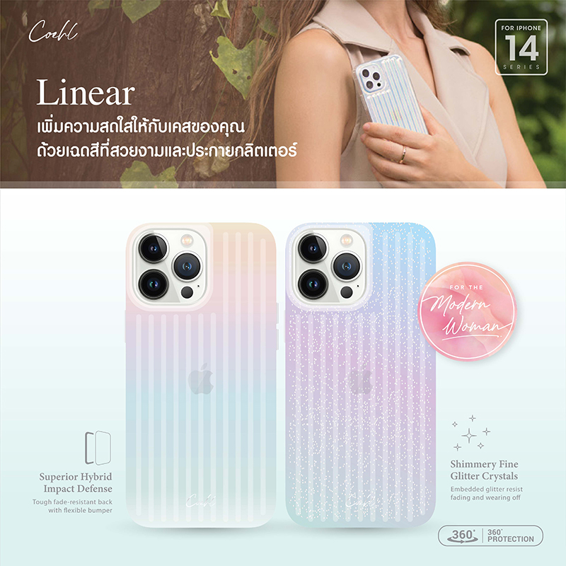 - รุ่น Linear เคสโปร่งแสง โดดเด่นด้วยการไล่เฉดสีพร้อมเพิ่มประกายความแวววาวสดใสให้กับเคสของคุณ ขอบเคสผลิตจากวัสดุ IML TPU ที่มีความยืดหยุ่นสูง ทนทาน พร้อมป้องกันรอยขีดข่วนได้เป็นอย่างดี มาพร้อมดีไซน์ที่บางเบาและปุ่มสัมผัสที่แม่นยำ COEHL by UNIQ รุ่น Linear มี 2 สี ได้แก่ สี STARDUST และสี IRIDESCENT วางจำหน่ายในราคา 890 บาท