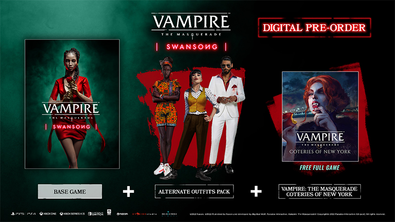 สำหรับผู้สั่งซื้อ Vampire: The Masquerade – Swansong ในรูปแบบดิจิตอลล่วงหน้าจะได้รับ Vampire: The Masquerade – Coteries of New York ทันที รวมไปถึงชุด outfit pack for Galeb, Emem และ Leysha