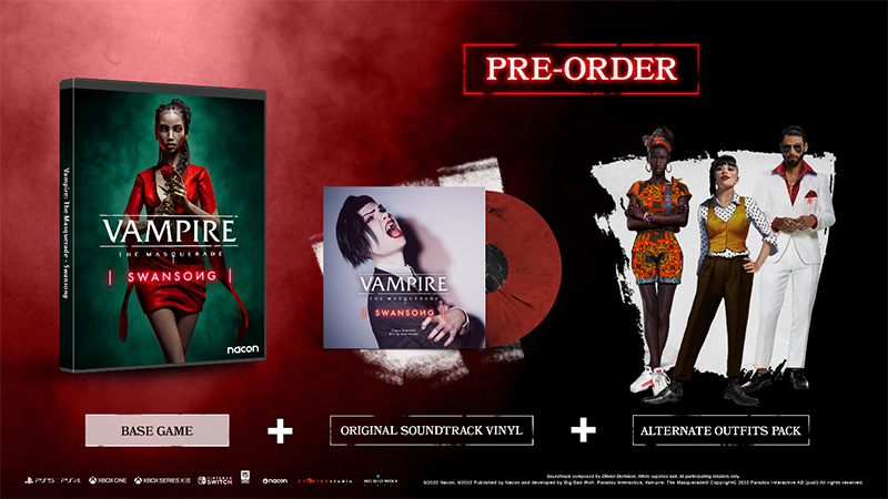 สำหรับผู้สั่งซื้อ Vampire: The Masquerade – Swansong ในรูปแบบแผ่นล่วงหน้าจะได้รับ The Original Soundtrack Composed by Olivier Deriviere on Vinyl รวมไปถึง Outfit Pack