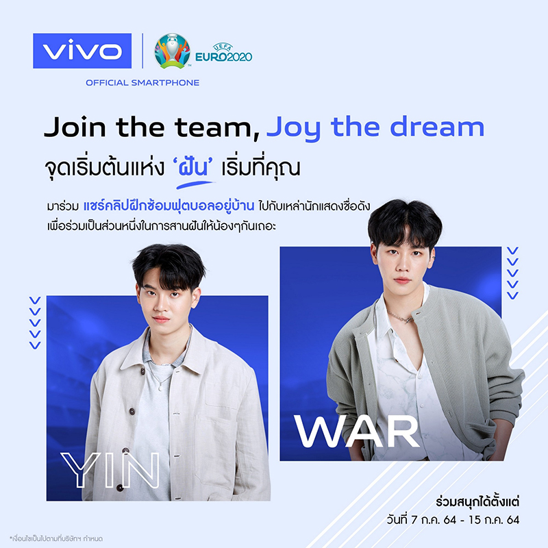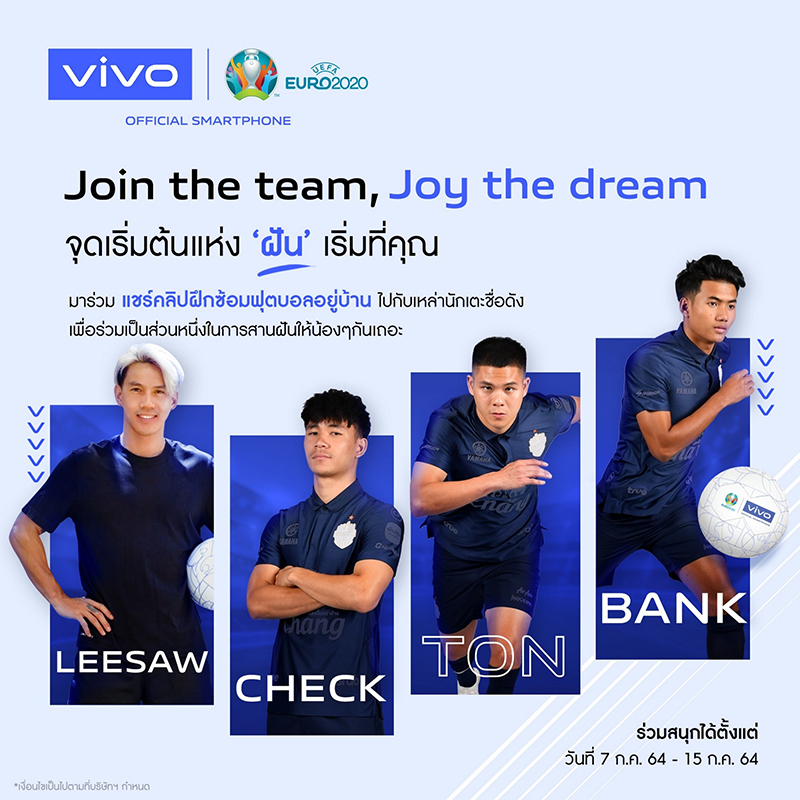 vivo แบรนด์สมาร์ตโฟนชั้นนำระดับโลก ในฐานะผู้สนับสนุนการแข่งขันฟุตบอล ชิงแชมป์แห่งชาติยุโรป 2020 หรือ ‘UEFA EURO 2020™’ อย่างเป็นทางการ ประกาศเปิดตัวแคมเปญ “Join the Team, Joy the Dream จุดเริ่มต้นแห่ง ‘ฝัน’ เริ่มที่คุณ” เชิญชวนเยาวชนชาวไทยและเหล่าแฟนบอลมาร่วมฝึกทักษะการเล่นฟุตบอลไปกับนักเตะไทยชื่อดังจากหลากหลายสโมสร ไม่ว่าจะเป็น ลีซอ – ธีรเทพ, ต้น – นฤบดินทร์, แบงค์ – ศุภณัฏฐ์, เช็ค – สุภโชค และ ก้อง – เกริกฤทธิ์ รวมทั้งเหล่านักแสดงวัยรุ่น หยิ่น – อานันท์, วอร์ – วนรัตน์ ที่จะมาส่งต่อแรงบันดาลใจไปพร้อมกันในฐานะบุคคลต้นแบบให้กับเยาวชนไทยและผู้ที่หลงใหลในกีฬาฟุตบอล ผ่านวิดีโอคอนเทนต์ (Video content) สอนทักษะและแชร์เทคนิคการเล่นฟุตบอลในแบบฉบับของตนเองบนช่องทางโซเชียลมีเดียกับ #JointheTeamJoytheDream เปิดโอกาสให้เยาวชนและแฟนบอลได้ร่วมฝึกทักษะการเล่นฟุตบอลกับนักเตะคนโปรดได้แบบง่ายดายในระหว่างหยุดอยู่บ้าน