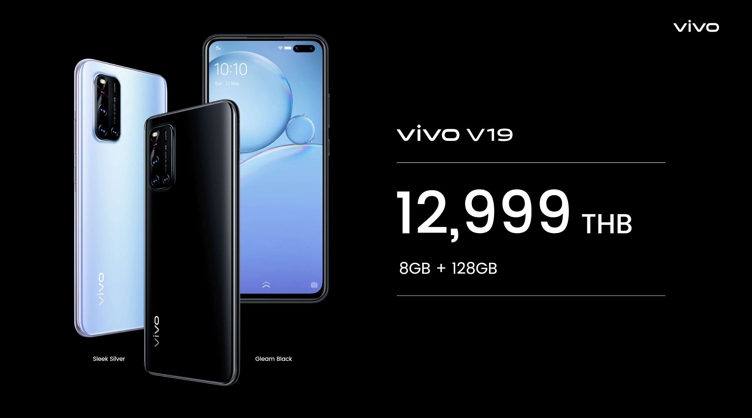 Vivo V19 สี Gleem Black (ดำ) และ Sleek Silver (เงิน) จะวางขายในประเทศไทยอย่างเป็นทางการในวันที่ 8 พฤษภาคม 2563 ในราคา 12,999 บาท