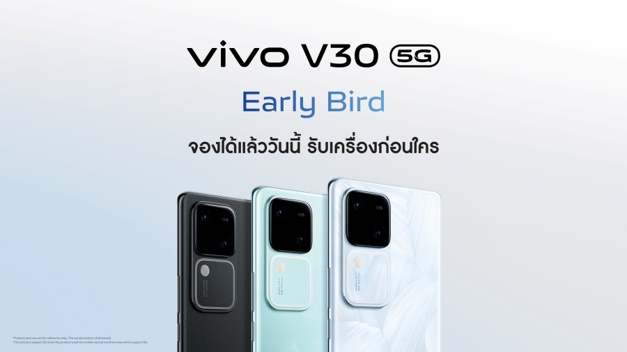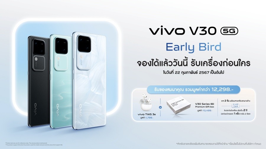 พิเศษสำหรับแฟน ๆ ที่สนใจ vivo V30 5G และ vivo V30 Pro 5G ซึ่งเริ่มเปิดให้จับจองแล้วในรอบ Early Bird โดยมอบสิทธิให้เป็นเจ้าของก่อนใคร พร้อมรับของสมนาคุณมูลค่ากว่า 10,000 บาท จองก่อน เทพก่อน ตั้งแต่วันนี้ – วันที่ 28 กุมภาพันธ์ 2567 สำหรับ vivo V30 5G และวันที่ 29 กุมภาพันธ์ – 14 มีนาคม 2567 สำหรับ vivo V30 Pro 5G