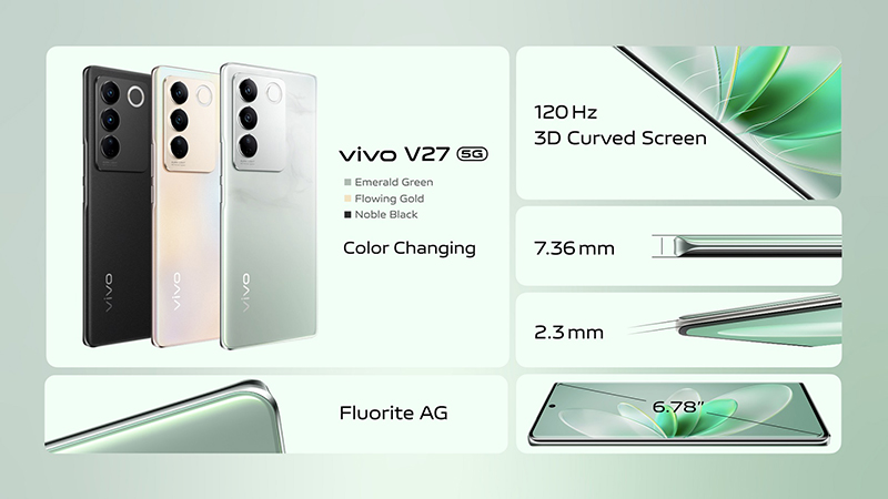 vivo V27 5G เปิดตัวพร้อมสีสันใหม่อย่างสีเขียวหยก หรือ Emerald Green” ที่ได้รับแรงบันดาลใจจากหยกอัญมณีที่สื่อถึงความงดงามบริสุทธิ์และความสง่างามดั่งของขวัญที่ธรรมชาติรังสรรค์ขึ้น ฝาหลังผลิตด้วยนวัตกรรมกระจกเคลือบสีเขียวหยกเป็นครั้งแรกของวงการสมาร์ตโฟน ผสานเทคโนโลยี Color-Changing เฉพาะของ vivo เมื่อสัมผัสแสงยูวีฝาหลังจะไล่ระดับเฉดสี เป็นโทนสีเขียวหยกที่สว่างและเข้ม สร้างความรู้สึกและประสบการณ์การใช้งานที่แปลกใหม่ โดยก่อนเปลี่ยนสี จะให้ความรู้สึกที่สดใส บริสุทธิ์ เต็มไปด้วยชีวิตชีวา แต่เมื่อเปลี่ยนสีเป็นโทนสีเขียวเข้ม จะให้ความรู้สึกที่สุขุมนุ่มลึก สงบ เหมือนโอบล้อมอยู่ท่ามกลางภูเขาเขียวขจีและทะเลสาบ พร้อมขอบโทนสีเทาจาง ๆ บริเวณมุมโดยรอบเครื่อง ทำให้รูปลักษณ์ของ vivo V27 5G ดูเรียบหรู โดดเด่น และสง่างามสะกดทุกสายตา