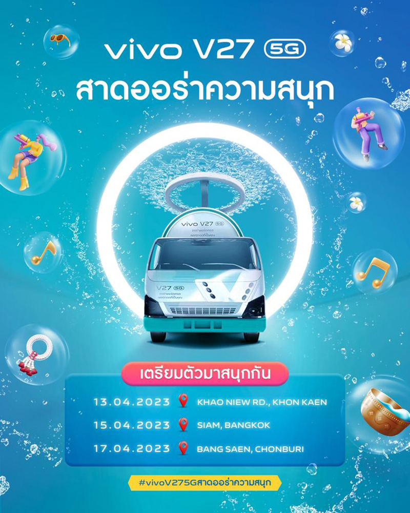 vivo แบรนด์สมาร์ตโฟนชั้นนำระดับโลก เตรียมสาดความสนุกต้อนรับเทศกาลสงกรานต์ในปีนี้กับแคมเปญสุดยิ่งใหญ่ ‘vivo V27 5G สาดออร่าความสนุก’ เอาใจสายคอนเทนต์ตัวจริง กับ V27 5G สมาร์ตโฟนรุ่นล่าสุดจากตระกูล V Series ที่ช่วยให้ภาพพอร์ตเทรตของทุกคนมีออร่ากว่าที่เคย เตรียมพบกับขบวนคาราวาน vivo V27 5G ที่จะขนความมันส์ไปสาดทุกคนให้ชุ่มฉ่ำได้สัมผัสกับความสุขกันทั่วทั้งประเทศ สนุกสนานไปกับบูธดีเจเคลื่อนที่ และกิจกรรมท้าให้ลองถ่ายภาพพอร์ตเทรตด้วย vivo V27 5G ตลอดทั้งวันไม่ว่าจะเป็นช่วงเวลากลางวันหรือกลางคืน จะแสงไหนก็เอาอยู่ พร้อมโพสต์ภาพและติดแฮชแท็ก #vivoV275Gสาดออร่าความสนุก เพื่อลุ้นรับรางวัลใหญ่สุดเซอร์ไพรส์จาก vivo แล้วมาพบกันกับ 3 พื้นที่สงกรานต์สุดฮิตทั่วไทยจัดเต็ม 3 วัน ให้แฟนๆ ได้สัมผัสประสบการณ์กันอย่างใกล้ชิดตลอดช่วงเทศกาลปีใหม่ไทยในปีนี้