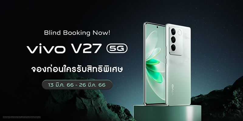 พิเศษสำหรับ vivo fans ตัวจริง สามารถสั่งจอง vivo V27 5G ล่วงหน้าในรอบ Blind Booking กับโปรโมชันสุดคุ้ม จอง V27 5G (8GB + 256GB) รับส่วนลด 500 บาท หรือ เลือกอัปเกรด RAM จาก 8GB เป็น 12GB พร้อมรับ Limited Boxset ของสมนาคุณสุดพิเศษ (มูลค่ารวมกว่า 11,298 บาท) หรือ จอง V27 5G (12GB + 256GB) รับส่วนลด 500 บาท พร้อมรับหูฟัง TWS Air และ Limited Boxset ของสมนาคุณสุดพิเศษ (มูลค่ารวมกว่า 13,297 บาท) ตั้งแต่วันนี้ – 26 มีนาคม 2566 ที่ vivo Brand Shop ทุกสาขาและตัวแทนจำหน่ายตามห้างสรรพสินค้าชั้นนำทั่วประเทศ