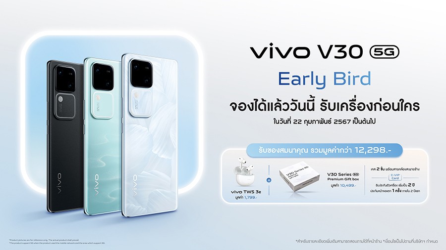 มาร่วมจับจองเป็นเจ้าของความเทพก่อนใครได้แล้ววันนี้! vivo พร้อมเปิดให้ผู้ที่สนใจสามารถลงทะเบียนจับจองรุ่น V30 5G ในรอบ Early Bird ตั้งแต่วันนี้ถึงวันที่ 28 กุมภาพันธ์ 2567 พร้อมสิทธิ์รับเครื่องก่อนใคร (ตั้งแต่วันที่ 22 กุมภาพันธ์เป็นต้นไป) และสำหรับรุ่น V30 Pro 5G จะเริ่มเปิดจองตั้งแต่วันที่ 29 กุมภาพันธ์ – 14 มีนาคม 2567 พร้อมส่วนลดทันที 500 บาท โดยทั้ง 2 รุ่นจะมาพร้อมกับของสมนาคุณรวมมูลค่ากว่า 12,298 บาท ได้แก่ หูฟัง vivo TWS 3e มูลค่า 1,799 บาท และ V30 Series 5G Premium Gift Box มูลค่า 10,499 บาท ภายในประกอบด้วยเคส 2 ชิ้น และ E-VIP Card รับประกันตัวเครื่องเพิ่มเป็น 2 ปี และประกันหน้าจอแตก 1 ครั้ง ภายใน 2 ปีแรก ติดตามรายละเอียดเพิ่มเติมได้ที่เว็บไซต์ vivo.com/th