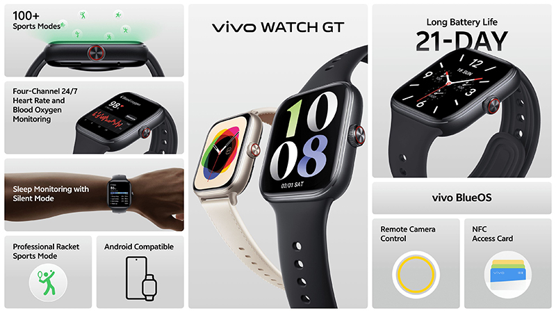 vivo เสริมทัพความแกร่งด้วยการเปิดตัว vivo Watch GT สมาร์ตวอตช์หน้าปัดทรงสี่เหลี่ยมรุ่นแรกจาก vivo มาพร้อมดีไซน์หรูหราทันสมัย น้ำหนักเบาเพียง 33 กรัม และหน้าจอ 2.5D HD AMOLED ขนาด 1.85 นิ้ว รองรับ Always-on Display สวมใส่สบายเข้ากับสรีระข้อมือ นำเสนอบน 2 ดีไซน์ที่สามารถเลือกปรับเปลี่ยนได้ตามสไตล์ของผู้ใช้งาน ได้แก่ สีดำซัมเมอร์ แบล็ก (Summer Black) บนสายซิลิโคน ให้ความรู้สึกเรียบง่าย เหมาะสำหรับการใช้งานในทุก ๆ วัน และสีขาวคลาวด์ ไวท์ (Cloud White) บนสายหนังแบบคลาสสิก เพื่อสัมผัสที่เรียบหรูยิ่งขึ้น