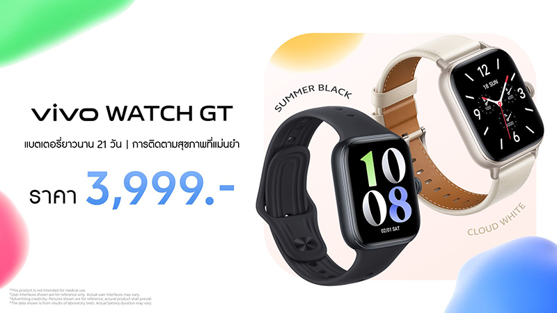 พร้อมกันนี้ vivo ยังวางจำหน่าย vivo Watch GT อย่างเป็นทางการใน 2 ตัวเลือกสีและดีไซน์ ได้แก่ สีดำซัมเมอร์ แบล็ก (Summer Black) พร้อมสายซิลิโคนเพื่อการใช้งานในชีวิตประจำวัน และสีขาวคลาวด์ ไวท์ (Cloud White) พร้อมสายหนังแบบเรียบหรูและคลาสสิก ในราคาเพียง 3,999 บาท