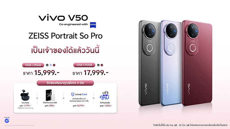 เปิดตัว vivo V50 สมาร์ตโฟนพอร์ตเทรตกล้อง ZEISS ‘ถ่ายที่รักอย่างโปร’ ราคาเริ่มต้น 15,999 บาท