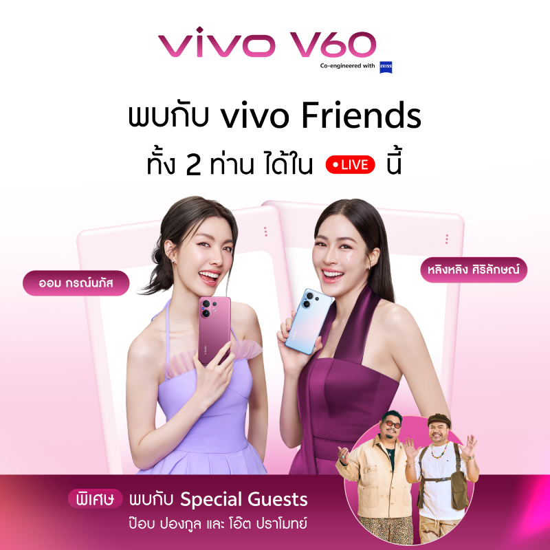 vivo แบรนด์สมาร์ตโฟนชั้นนำระดับโลก เตรียมกลับมาสร้างปรากฏการณ์พอร์ตเทรตครั้งใหม่ ด้วยการเปิดตัว vivo V60 สมาร์ตโฟนรุ่นล่าสุดจากตระกูล V Series ให้แฟน ๆ ชาวไทยได้สัมผัสภายใต้คอนเซ็ปต์ ‘เสิร์ฟช็อตโปรให้คนสวย’ พร้อมชวนสองนักแสดงสาวสุดฮอตอย่าง ‘หลิงหลิง – ศิริลักษณ์ คอง’ และ ‘ออม – กรก์นภัส เศรษฐรัตนพงศ์’ มาร่วมงานในฐานะ vivo friends เป็นครั้งแรก พร้อมเสิร์ฟความสวยผ่านเทคโนโลยีพอร์ตเทรตระดับโปรและเติมเต็มสีสันให้กับแฟน ๆ ทั่วประเทศ พบกันอย่างเป็นทางการวันที่ 27 สิงหาคมนี้!
