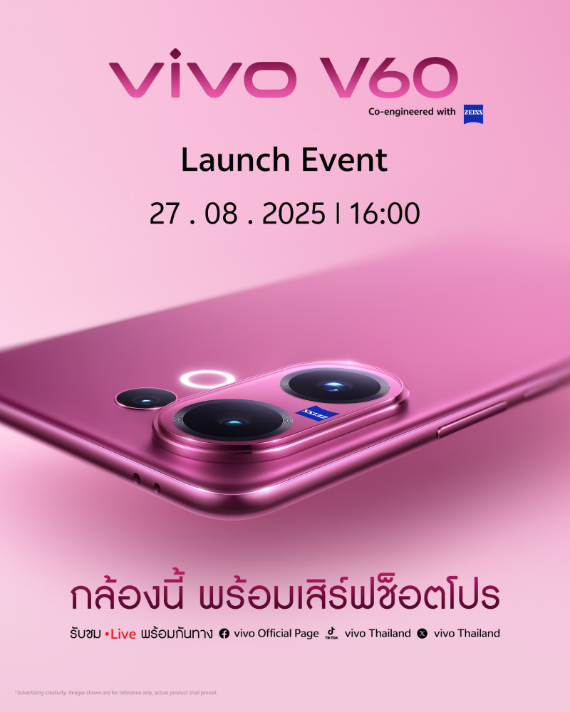 เตรียมชัตเตอร์ให้พร้อม! เพราะงานนี้ vivo เตรียมจัดเต็มความพิเศษด้วยการขนทัพคนดังและอินฟลูเอนเซอร์เข้ามาร่วมสร้างสีสันให้กับการเปิดตัว vivo V60 อย่างเป็นทางการอย่างเต็มที่ เพื่อถ่ายทอดความตั้งใจที่จะมอบประสบการณ์ระดับโปรให้ทุกคนได้ใกล้ชิดแบบสนุกสนานยิ่งกว่าเคย แล้วมา ‘เสิร์ฟช็อตโปรให้คนสวย’ ไปกับ vivo V60 และ vivo friends ‘หลิง – ออม’ พร้อมด้วยสองศิลปินหนุ่มอารมณ์ดี ‘โอ๊ต – ปราโมทย์’ และ ‘ป๊อป – ปองกูล’ ที่จะมาพูดคุยและส่งมอบมินิคอนเสิร์ตสุดพิเศษภายในงานเปิดตัวอย่างเป็นทางการไปพร้อมกัน วันที่ 27 สิงหาคมนี้!