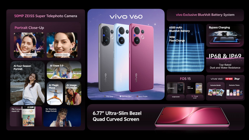 เปิดตัว vivo V60 ยกระดับพอร์ตเทรตด้วยกล้องซูเปอร์เทเลโฟโต้ ราคาเริ่มต้น 15,999 บาท