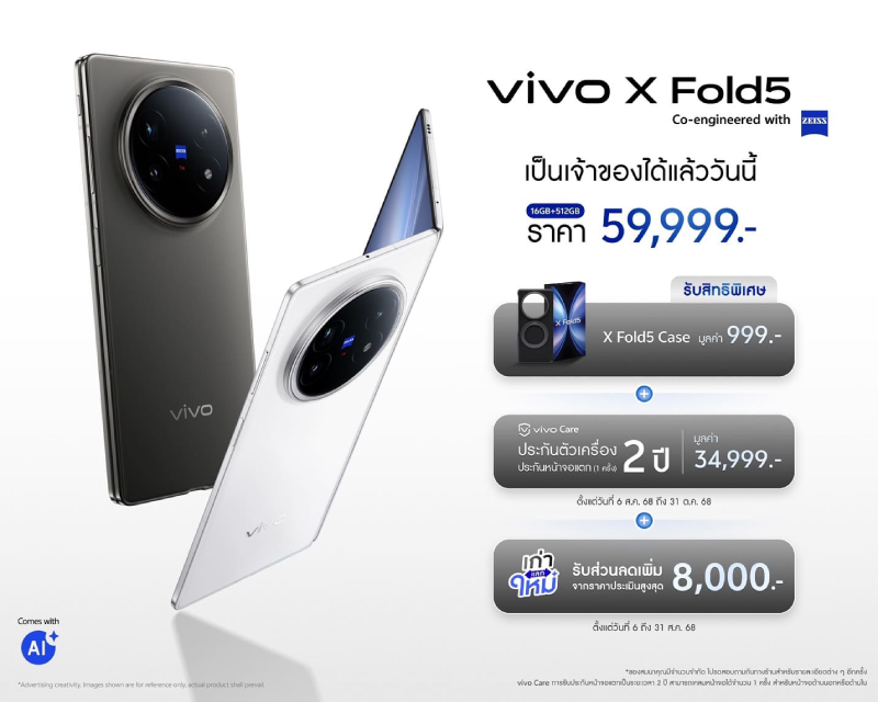 vivo X Fold5 เปิดตัวให้ผู้ใช้งานชาวไทยได้มาพับอย่างมีคลาสพร้อมกันแล้ววันนี้ ในราคา 59,999 บาท สำหรับรุ่นความจุ 16GB + 512GB วางจำหน่ายที่ vivo Brand Shop ทุกสาขา ช่องทางออนไลน์ และตัวแทนจำหน่ายทั่วประเทศ พิเศษ! สำหรับผู้ที่จับจองเป็นเจ้าของภายในวันที่ 6 – 31 สิงหาคม 2568 นี้ รับของสมนาคุณมูลค่ารวมสูงสุดกว่า 35,998 บาทไปเลยทันที ได้แก่