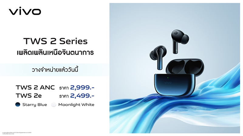 นอกจากนี้ vivo ยังพร้อมให้ผู้ใช้งานได้สัมผัสประสบการณ์คุณภาพเสียงเหนือระดับและเพลิดเพลินเหนือจินตนาการ กับหูฟังไร้สายรุ่นใหม่ vivo TWS 2 Series มีให้เลือก 2 รุ่นด้วยกัน คือ vivo TWS 2 ANC มาพร้อมกับระบบตัดเสียงรบกวนอัจฉริยะ พร้อมคุณภาพเสียงคมชัดระดับ Deep-HD Audio กับดีไซน์โค้งมนทันสมัย ใช้งานได้ต่อเนื่องยาวนานถึง 29 ชั่วโมง วางจำหน่ายที่ราคา 2,999 บาท และอีกหนึ่งรุ่นคือ vivo TWS 2e มาพร้อมกับระบบการตัดเสียงรบกวนแบบ Dual-Mic และระบบเสียงเอฟเฟกต์ระดับมืออาชีพ ใช้งานได้ยาวนานต่อเนื่องถึง 30 ชั่วโมง วางจำหน่ายที่ราคา 2,499 บาท มีให้เลือกทั้งหมดสองสี ได้แก่ Starry Blue และ Moonlight White