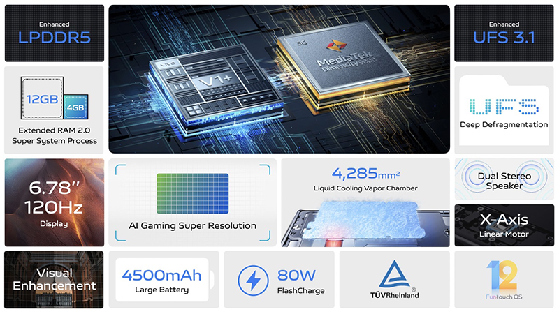 ด้วยเทคโนโลยีที่ก้าวล้ำของ vivo ในการพัฒนาประสิทธิภาพการถ่ายภาพและวิดีโอบนสมาร์ตโฟน vivo X80 Series 5G จึงถูกออกแบบให้สเปกภายในตัวเครื่องทรงพลัง พร้อมตอบโจทย์การใช้งานอย่างมีประสิทธิภาพในทุกด้าน vivo X80 Pro 5G ขับเคลื่อนด้วยขุมพลังชิปเซต Snapdragon 8 Gen 1 ในขณะที่รุ่น X80 5G ขับเคลื่อนด้วย MediaTek Dimensity 9000 มอบประสิทธิภาพในการประมวลผลของ CPU และ GPU ขั้นสูงสุด โดยโปรเซสเซอร์ทั้งสองชุดนี้ทำให้ผู้ใช้งานสามารถเชื่อมต่อ 5G ในชีวิตประจำวันได้อย่างมีประสิทธิภาพสูงสุดและยังช่วยประหยัดพลังงานกว่า X Series รุ่นก่อน อีกทั้ง X80 Series 5G ยังได้รับการเสริมประสิทธิภาพด้วย RAM LPDDR5 และหน่วยความจำภายใน (ROM) UFS3.1 เพิ่มความเสถียรภาพในการใช้งานและเพิ่มขนาดความจุในการจัดเก็บข้อมูลภายในตัวเครื่องมากยิ่งขึ้น