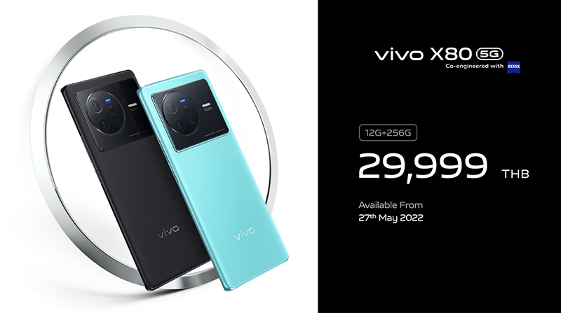vivo แบรนด์สมาร์ตโฟนชั้นนำระดับโลก ประกาศเปิดตัว vivo X80 Series 5G สมาร์ตโฟนเรือธงรุ่นล่าสุดจากไลน์อัป X Series ในประเทศไทยอย่างเป็นทางการ ที่จะมายกระดับประสบการณ์ถ่ายวิดีโอระดับมืออาชีพให้แก่ผู้ใช้งาน มาพร้อมกับเทคโนโลยีเลนส์กล้องระดับโลกที่ร่วมมือกับ ZEISS พัฒนาขึ้นเพื่อสร้างที่สุดแห่งประสบการณ์การถ่ายภาพและวิดีโอบนสมาร์ตโฟน จับคู่กับชิปประมวลผลภาพระดับโปรที่พัฒนาขึ้นโดย vivo อย่างชิป vivo V1+ รวมถึงเทคโนโลยีใหม่ล่าสุดเพื่อเพิ่มคุณภาพรูปถ่ายและวิดีโอบนสมาร์ตโฟนให้เหนือกว่าที่เคย พร้อมสเปกเครื่องเร็ว แรง มอบประสบการณ์ที่ดีที่สุดให้แก่ผู้ใช้งาน vivo X80 Series 5G มีให้เลือกทั้งรุ่น vivo X80 5G เตรียมวางจำหน่ายในราคา 29,999 บาท และ vivo X80 Pro 5G ในราคา 39,999 บาท