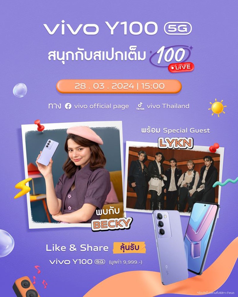 เตรียมพบความสนุกแบบจัดเต็ม! vivo จัดกิจกรรมสุดพิเศษเอาใจ vivo fans ตามหาผู้โชคดีทั้ง 20 ท่าน เพื่อมาร่วมสนุกในไลฟ์เปิดตัว Y100 5G พร้อมกับดาราและศิลปินชื่อดัง นำทีมโดยพรีเซนเตอร์สาวสวยลูกครึ่งไทย-อังกฤษ เบคกี้ – รีเบคก้า แพทรีเซีย อาร์มสตรอง ที่จะมาร่วมแกะกล่องและแชร์ประสบการณ์การใช้งานจริงของสมาร์ตโฟน Y100 5G พร้อมรับชมการแสดงจาก 5 หนุ่มบอยแบนด์น้องใหม่แห่งวงการ T-POP อย่าง LYKN ที่จะมาสร้างสีสันและมอบความตื่นเต้นครั้งใหญ่ในงานเปิดตัวครั้งนี้