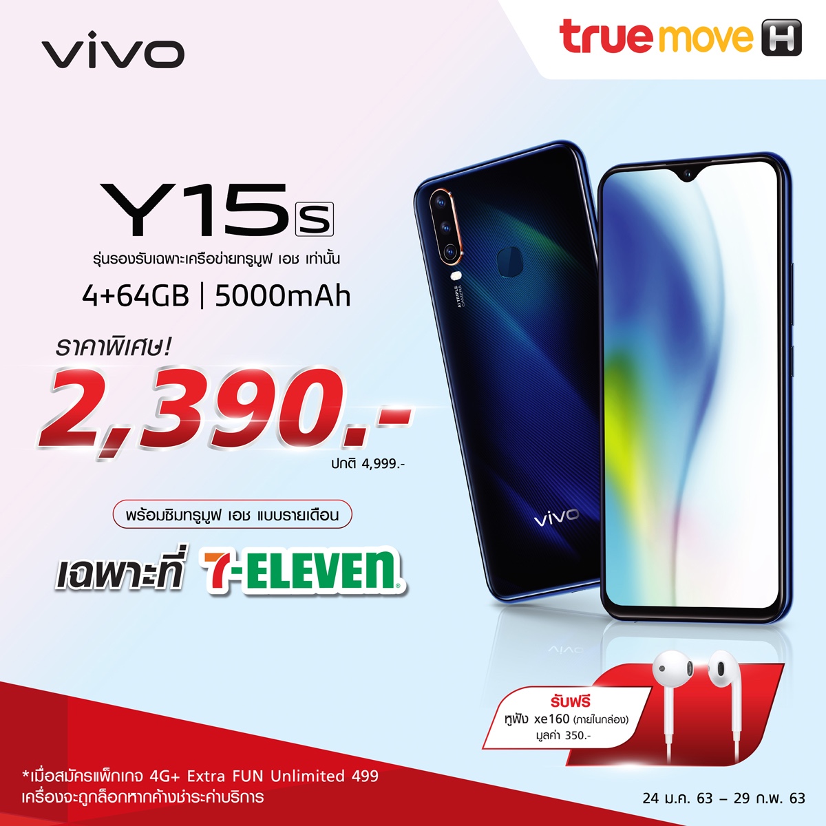 - Vivo Y15s รุ่นรองรับเฉพาะเครือข่ายทรมูฟ เอช เพียง 2,390 บาท (ปกติ 4,999 บาท) เมื่อซื้อเครื่องพร้อมซิมทรูมูฟ เอช แบบรายเดือน แพ็กเกจ 4G+ Extra Fun Unlimited 499