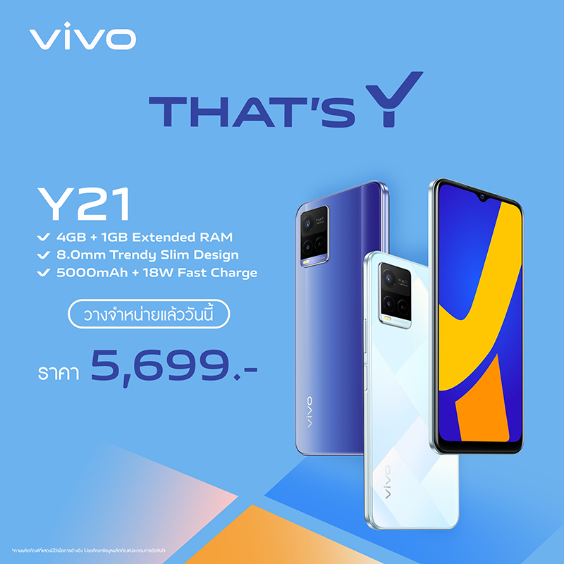 vivo Y21 RAM 4GB ความจำ 64GB พร้อมวางจำหน่ายอย่างเป็นทางการแล้วตั้งแต่วันนี้เป็นต้นไป ที่ราคา 5,699 บาท ณ vivo Brand Shop ทุกสาขา ตัวแทนจำหน่ายทั่วประเทศ ผู้ให้บริการเครือข่าย และช่องทางออนไลน์ vivo Official Store