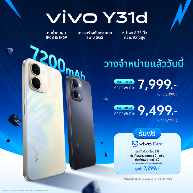 พิเศษยิ่งขึ้นอีก! รับฟรี vivo Care มูลค่า 7,299 บาท รับประกันตัวเครื่อง 2 ปี ประกันหน้าจอแตก 1 ครั้งภายใน 2 ปีและประกันแบตเตอรี่ยาวนานถึง 4 ปี (ราคาและโปรโมชันตั้งแต่วันที่ 24 เมษายน – 31 พฤษภาคม 2569 เท่านั้น)