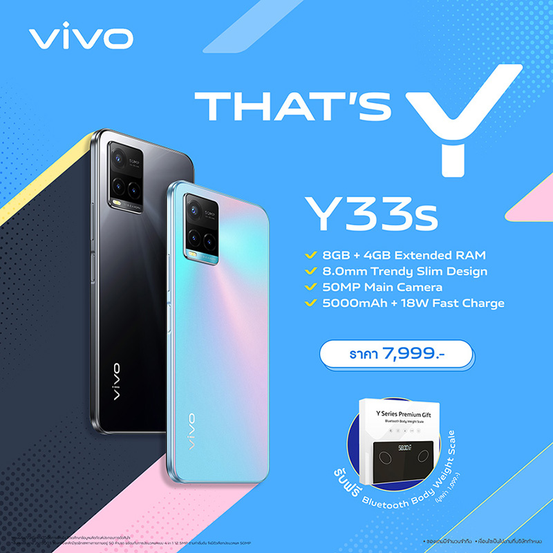vivo Y33s RAM 8GB ความจุ 128GB พร้อมวางจำหน่ายอย่างเป็นทางการแล้วตั้งแต่วันนี้เป็นต้นไป ในราคา 7,999 บาท พร้อมรับของแถมสุดพิเศษ เครื่องชั่งน้ำหนัก Bluetooth Body Weight Scale มูลค่า 1,099 บาท ณ vivo Brand Shop ทุกสาขา ตัวแทนจำหน่ายทั่วประเทศ