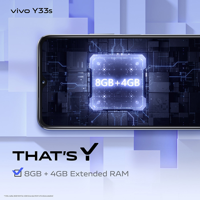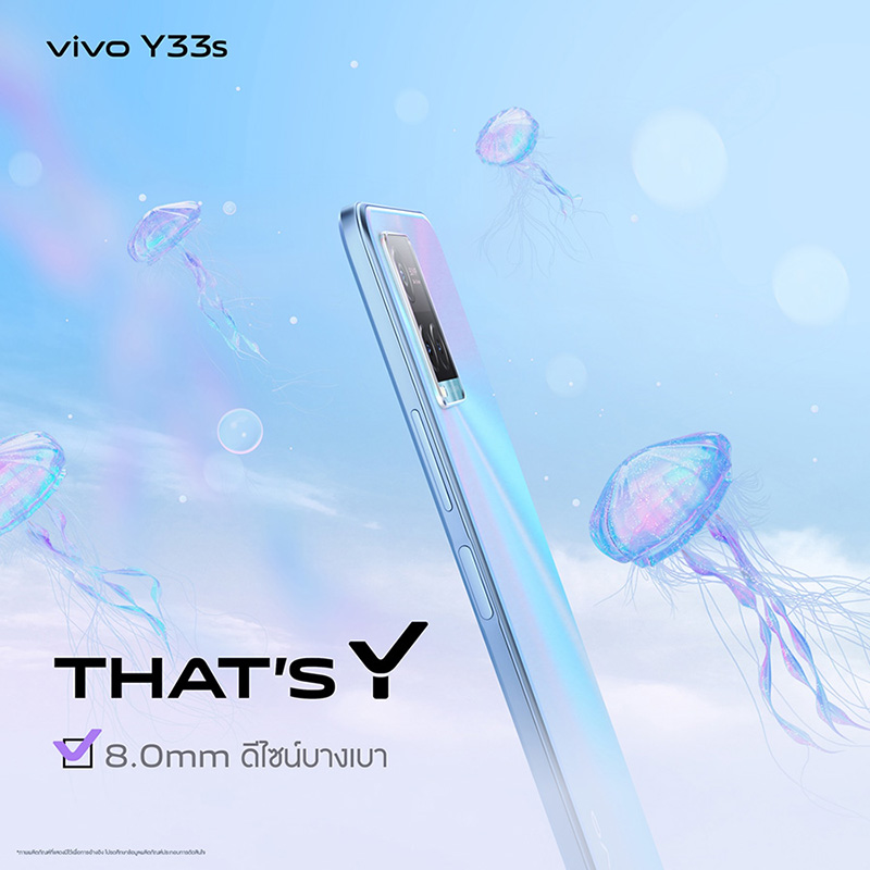 vivo แบรนด์สมาร์ตโฟนชั้นนำระดับโลก เปิดตัว vivo Y33s สมาร์ตโฟนรุ่นใหม่ล่าสุด สเปกครบครัน มาพร้อมความแรงให้ใช้งานอย่างลื่นไหลด้วย 8GB + 4GB Extended RAM และหน้าจอใหญ่เต็มตาขนาด 6.58 นิ้ว กล้องหลังความละเอียด 50MP จัดเรียงแบบ Dual Tone Step เอกลักษณ์เฉพาะตัวของ vivo ใช้งานได้ต่อเนื่องยาวนานตลอดทั้งวันด้วยแบตเตอรี่ความจุ 5000 mAh รองรับเทคโนโลยีชาร์จไว 18W ดีไซน์ตัวเครื่องบางเพียง 8 มม. พกพาสะดวก พร้อมตัวเลือก 2 สีใหม่ บ่งบอกสไตล์ได้ชัดเจน ทั้ง Mirror Black และ Midday Dream ตอบโจทย์ทุกการใช้งานพร้อมให้ทุกคนสนุกได้แบบ That’s Y ในราคา เพียง 7,999 บาท