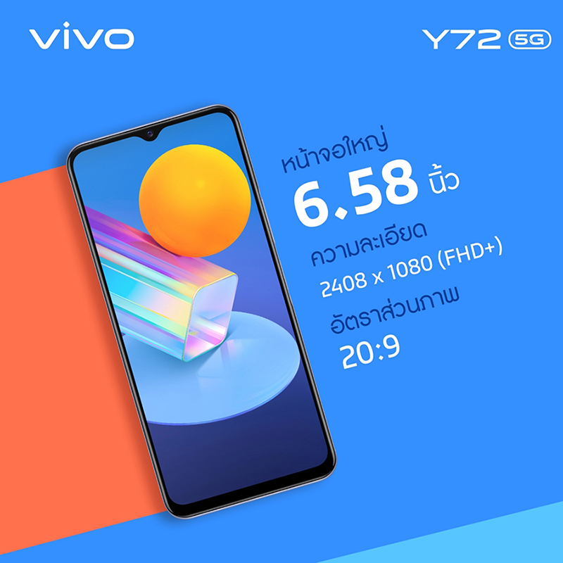 Vivo Y72 5G มาพร้อมกับเทคโนโลยีรองรับการเชื่อมต่อ 5G พร้อมแนวคิด ‘5G เข้าถึงทุกที่ ทุกเวลา’ เพื่อมอบประสบการณ์สุดลื่นไหลในทุกสถานการณ์ เก็บทุกภาพความประทับใจด้วยกล้องหลักความละเอียดสูงถึง 64 ล้านพิกเซล ถ่ายภาพได้คมชัดทุกท่วงท่า เลนส์มุมกว้างพิเศษ Super Wide-Angle (120 องศา) ความละเอียด 8 ล้านพิกเซล เก็บภาพได้กว้างสะใจทุกองศา และเลนส์ Super Macro ความละเอียด 2 ล้านพิกเซล สร้างสรรค์สิ่งเล็กๆ รอบตัวให้มีชีวิตชีวามากขึ้น พร้อมรองรับฟีเจอร์ Super Night Mode, Super Night Selfie, โหมดกันสั่น EIS และ Eye Autofocus