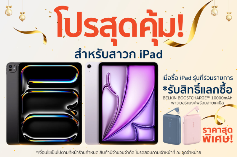 เมื่อซื้อ iPad Pro M5 หรือ iPad Air M3 รับสิทธิ์แลกซื้อ พาวเวอร์แบงค์ Belkin BOOST CHARGE™ ความจุ 10,000 mAh พร้อมสายเคเบิล ในราคาพิเศษเพียง 690 บาท จากราคาปกติ 1,490 บาท เพิ่มความสะดวกสบายในการใช้งานทุกที่ทุกเวลา
