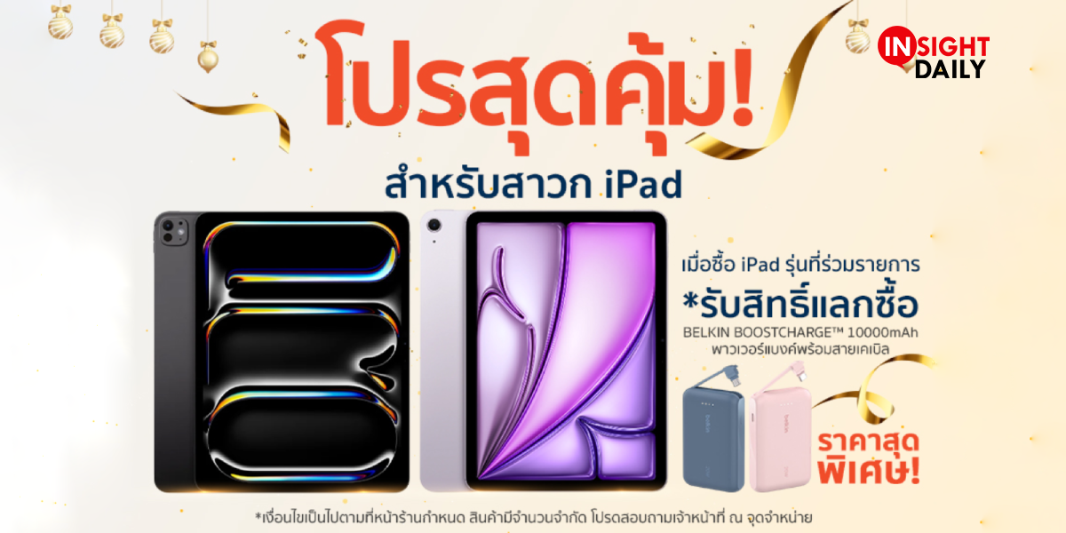 เมื่อซื้อ iPad Pro M5 หรือ iPad Air M3 รับสิทธิ์แลกซื้อ พาวเวอร์แบงค์ Belkin BOOST CHARGE™ ความจุ 10,000 mAh พร้อมสายเคเบิล ในราคาพิเศษเพียง 690 บาท จากราคาปกติ 1,490 บาท เพิ่มความสะดวกสบายในการใช้งานทุกที่ทุกเวลา