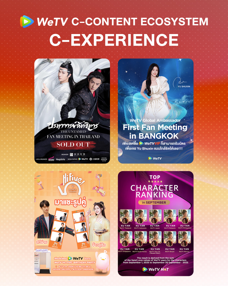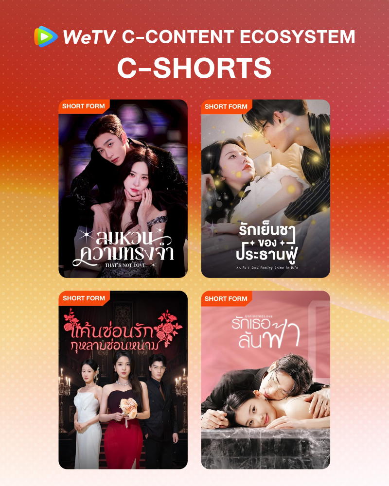 C-Shorts ฟีเจอร์ล่าสุดที่เพิ่มซีรีส์จีนแนวตั้งที่กำลังได้รับความนิยม และ C-Experience เพิ่มประสบการณ์ที่หลากหลายด้วยการจัดกิจกรรม O2O ทั้ง in-app และออนกราวนด์ เปิดโอกาสร่วมมือกับพันธมิตรแบรนด์ต่างๆ โดยคอนเทนต์ทั้ง 6 แกนมีเป้าหมายเพื่อตอบสนองไลฟ์สไตล์ของผู้ชมที่หลากหลายและเพื่อรักษาฐานคอมมิวนิตี้ของ WeTV ให้แข็งแกร่ง ตอกย้ำภาพลักษณ์ผู้นำอันดับหนึ่งด้านคอนเทนต์จีน (C-Content) ในไทย