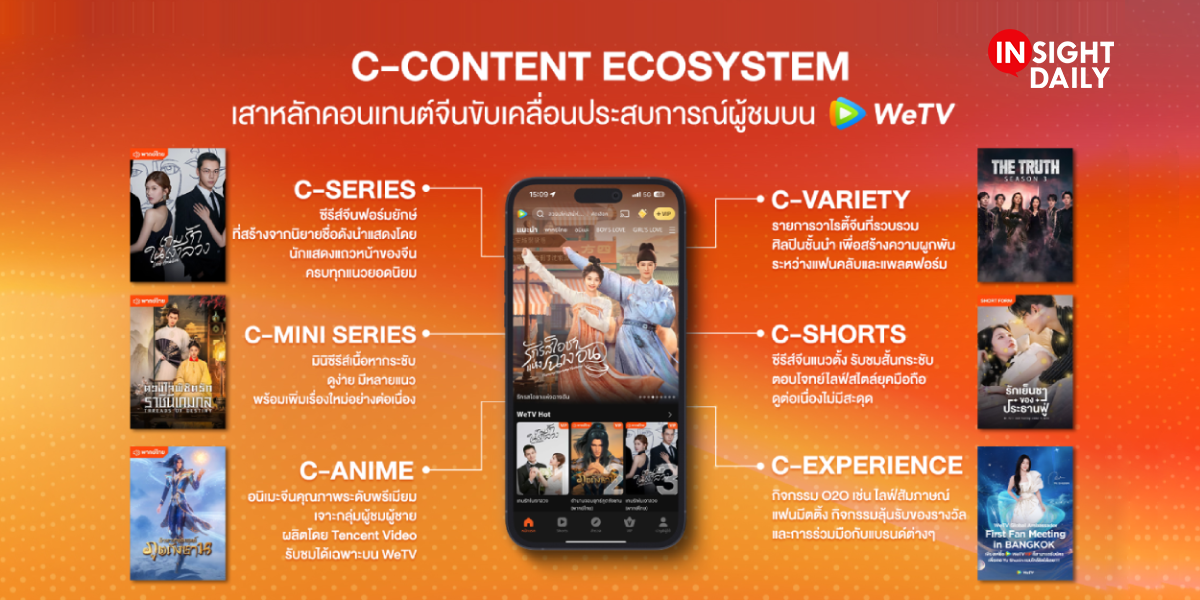 WeTV แพลตฟอร์มวิดีโอสตรีมมิงที่สุดความบันเทิงคุณภาพแห่งเอเชีย รุกตลาดชู C-Content Ecosystem เดินเกมมัดใจผู้ชมให้อยู่กับแพลตฟอร์มด้วย 6 แกนคอนเทนต์เรือธง ได้แก่ C-Series เน้นนำเสนอซีรีส์ฟอร์มยักษ์ระดับ S และ S+, C-Mini Series มินิซีรีส์ที่เน้นเนื้อหากระชับ ย่อยง่าย, C-Anime เพิ่มจำนวนอนิเมะจีนคุณภาพเพื่อขยายกลุ่มเป้าหมายไปถึงกลุ่มผู้ชาย, C-Variety นำเสนอวาไรตี้ใหม่ๆ ที่มีศิลปินจีนระดับแถวหน้ามาร่วมรายการ