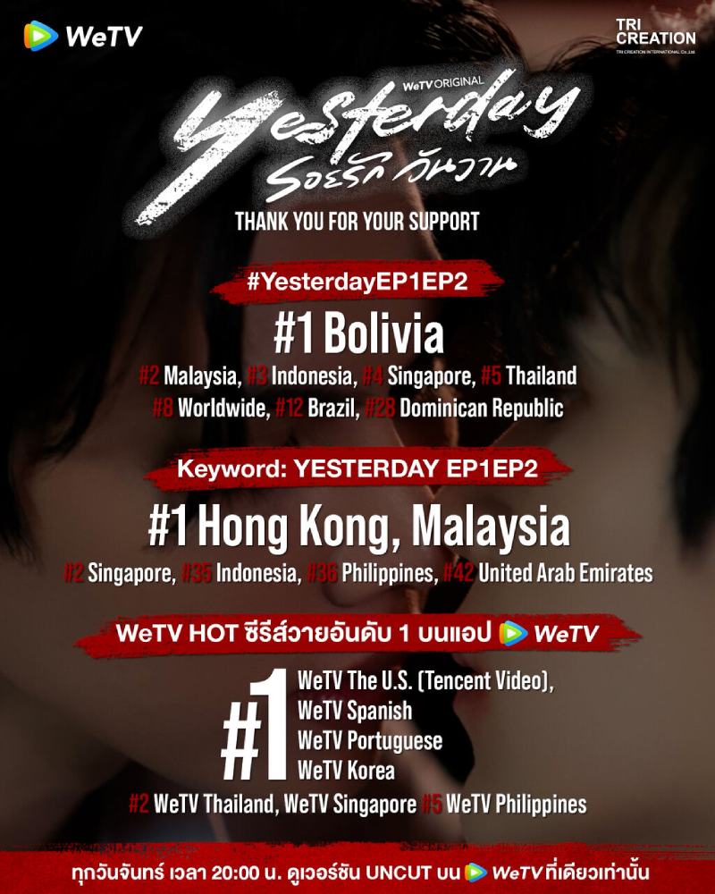 ไม่เพียงเท่านั้น แฮชแท็ก #YesterdayEP1EP2 และคีย์เวิร์ด YESTERDAY EP1EP2 ยังติดเทรนด์ X ในหลายประเทศทั่วโลก ทั้ง Worldwide, Thailand, Bolivia, Malaysia, Indonesia, Singapore, Brazil, Dominican Republic, Hong Kong และ United Arab Emirates ตอกย้ำความฮอตตั้งแต่เปิดตัว สมศักดิ์ศรีซีรีส์คุณภาพจาก WeTV Original