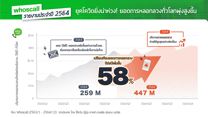 Whoscall เผยข้อมูลเกี่ยวกับแนวโน้มการโทรและข้อความหลอกลวงทาง SMS ทั่วโลกและประเทศไทย ซึ่งในปัจจุบันในยุคหลังการแพร่ระบาดของโควิด-19 ในปี 2564 จำนวนการโทรและข้อความหลอกลวงทั่วโลกมีจำนวนถึง 460 ล้านครั้ง เพิ่มขึ้น 58% จากปีที่แล้ว ซึ่งการหลอกลวงลักษณะนี้ยังคงเพิ่มสูงขึ้นอย่างรวดเร็ว และคาดว่าจะยังคงเพิ่มสูงขึ้นเรื่อย ๆ ภายหลังการแพร่ระบาด