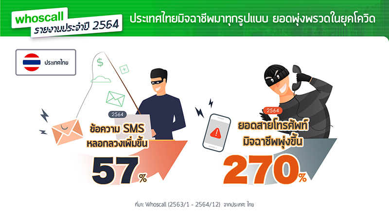 Whoscall แอปพลิเคชั่นป้องกันการฉ้อโกง ที่ถูกพัฒนาโดย Gogolook ผู้พัฒนาแอปพลิเคชั่นชั้นนำระดับโลก เปิดเผยว่า ในปี 2564 มีการใช้โทรศัพท์เพื่อหลอกลวงในประเทศไทยมากกว่า 6.4 ล้านครั้ง ซึ่งเพิ่มขึ้นถึง 270% จากปีก่อนหน้า ทั้งนี้ในปีเดียวกัน ข้อความ SMS หลอกลวงยังเพิ่มขึ้นถึง 57% โดยวิธีที่พบบ่อยนักต้มตุ๋นจะส่งลิ้งค์ฟิชชิ่งหลอกเชิญชวนให้ดาวน์โหลดแอปที่เป็นอันตรายและหลอกเอาข้อมูลส่วนตัวไป