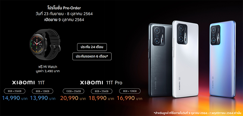 พิเศษ! เมื่อ Pre-Order Xiaomi 11T Pro และ Xiaomi 11T ทุกรุ่น ตั้งแต่วันที่ 23 กันยายน – 8 ตุลาคม 2564รับฟรี Mi Watch มูลค่า 3,490 บาท1