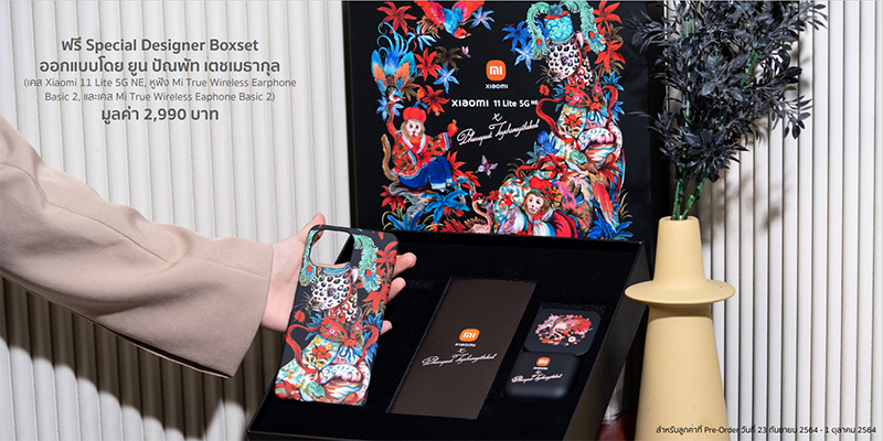 พิเศษ! เมื่อ Pre-Order Xiaomi 11 Lite 5G NE ตั้งแต่วันที่ 23 กันยายน – 1 ตุลาคม 2564 รับฟรี Special Designer Boxset โดย Yoon Phannapast หรือยูน-ปัณพัท เตชเมธากุล มูลค่า 2,990 บาท ประกอบไปด้วย เคสสมาร์ทโฟน Xiaomi 11 Lite 5G NE, หูฟัง Mi True Wireless Earphone Basic 2 และเคสหูฟัง
