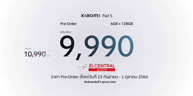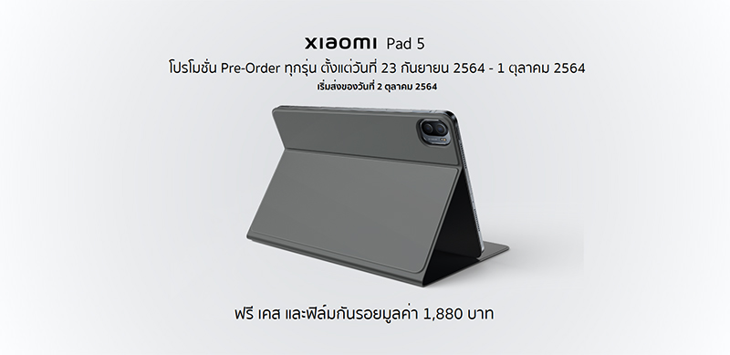 พิเศษ! เมื่อ Pre-Order Xiaomi Pad 5 ตั้งแต่วันที่ 23 กันยายน – 1 ตุลาคม 2564 รับฟรี เคสและฟิล์มกันรอยมูลค่า 1,880 บาท นอกจากนี้ สำหรับลูกค้าที่สั่งจอง Xiaomi Pad 5 รุ่นความจุ 6GB + 128GB รับราคาพิเศษเหลือเพียง 9,990 บาทอีกด้วย