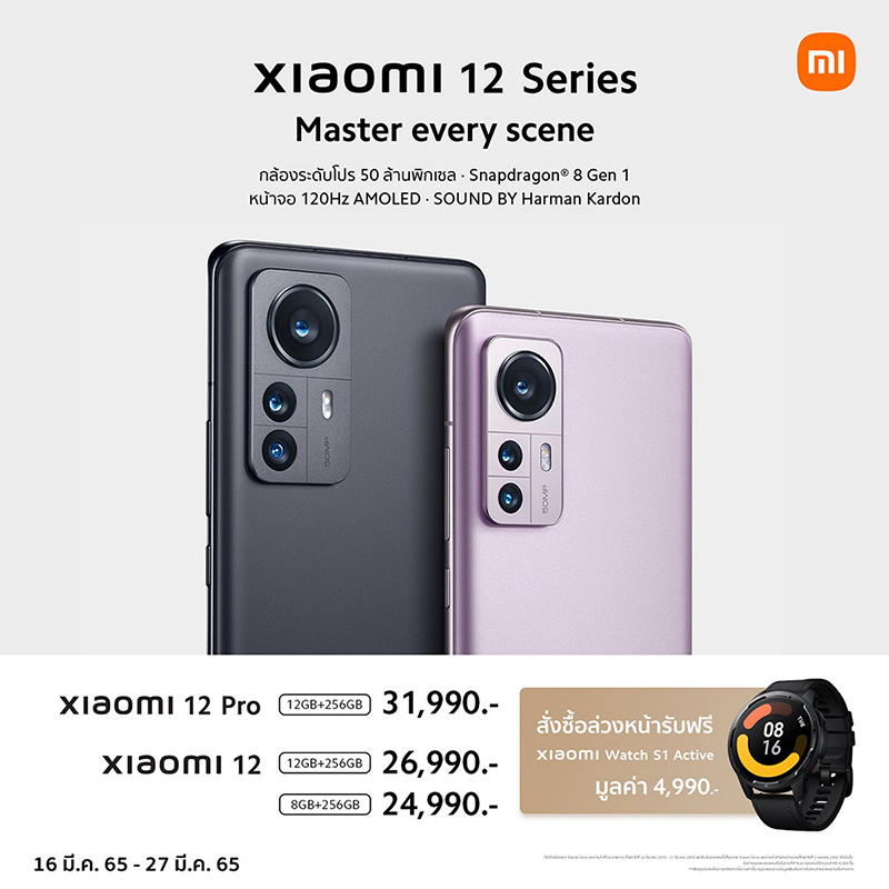 พิเศษ! สำหรับลูกค้าที่สั่งจอง Xiaomi 12 Pro หรือ Xiaomi 12 ในระหว่างวันที่ 16-27 มีนาคม 2565 รับฟรี** นาฬิกาอัจฉริยะ Xiaomi Watch S1 Active มูลค่า 4,990 บาท