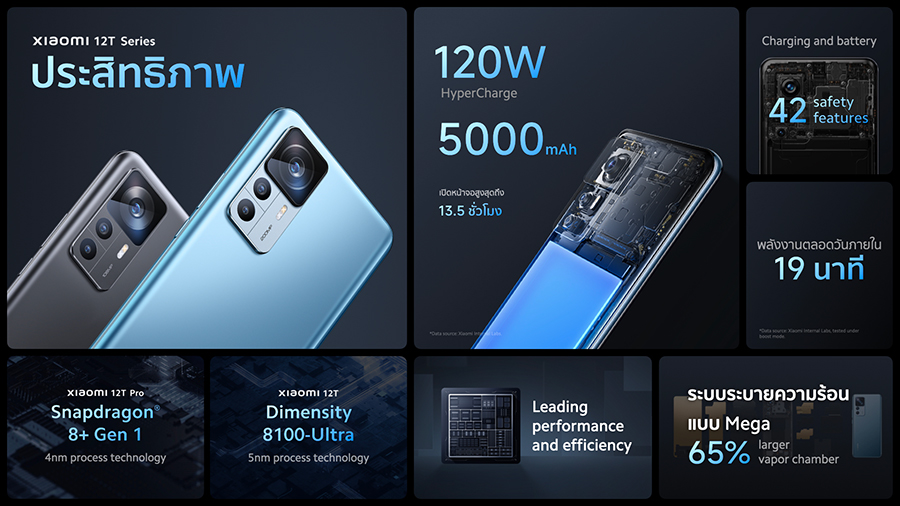 สำหรับด้านประสิทธิภาพการประมวลผลนั้น Xiaomi 12T Pro มาพร้อมโปรเซสเซอร์ Snapdragon® 8+ Gen 1 ด้วยกระบวนการผลิต 4nm TSMC ช่วยเพิ่มประสิทธิภาพการทำงานของ CPU และ GPU ได้มากถึง 16.7% และ 11% ตามลำดับ เมื่อเทียบกับ Snapdragon 8 Gen 1 และลดการใช้พลังงานของแต่ละตัวลงถึง 33% และ 30%2 นอกจากนี้ยังมีระบบระบายความร้อนที่ประกอบไปด้วยส่วนห้องไอน้ำที่ใหญ่ขึ้นถึง 65% และมีการใช้วัสดุกันความร้อนที่คลอบคลุมตัวอุปกรณ์มากกว่า Xiaomi 11T Pro ถึง 125% Xiaomi 12T Pro จึงมอบประสบการณ์การใช้งานที่ราบรื่นและประสิทธิภาพพลังงานที่ยอดเยี่ยมโดยที่คุณไม่จำเป็นต้องกังวลเรื่องความร้อนสูงเกินอีกต่อไป และสำหรับ Xiaomi 12T นั้น ขับเคลื่อนด้วยชิปเซ็ต MediaTek Dimensity 8100-Ultra ซึ่งสร้างขึ้นจากกระบวนการผลิต 5nm TSMC ตัวชิปนั้นได้รับการอัปเกรดด้วยโครงสร้าง GPU ใหม่ทั้งหมด จึงเพิ่มประสิทธิภาพและประสิทธิภาพการใช้พลังงานได้ถึง 30% เมื่อเทียบกับรุ่นก่อน ตลอดจนความเร็วนาฬิกา แคช และการจัดเก็บ ทำให้ผู้ใช้งานได้รับประสบการณ์การใช้งานที่รวดเร็วยิ่งขึ้น2 ไม่ว่าจะเป็นการถ่ายภาพและวิดีโอ การดูภาพยนตร์ หรือเล่นโซเชียลมีเดีย Xiaomi 12T ก็ให้คุณใช้งานด้วยประสิทธิภาพสูงสุดในทุกๆ ช่วงเวลาของคุณ