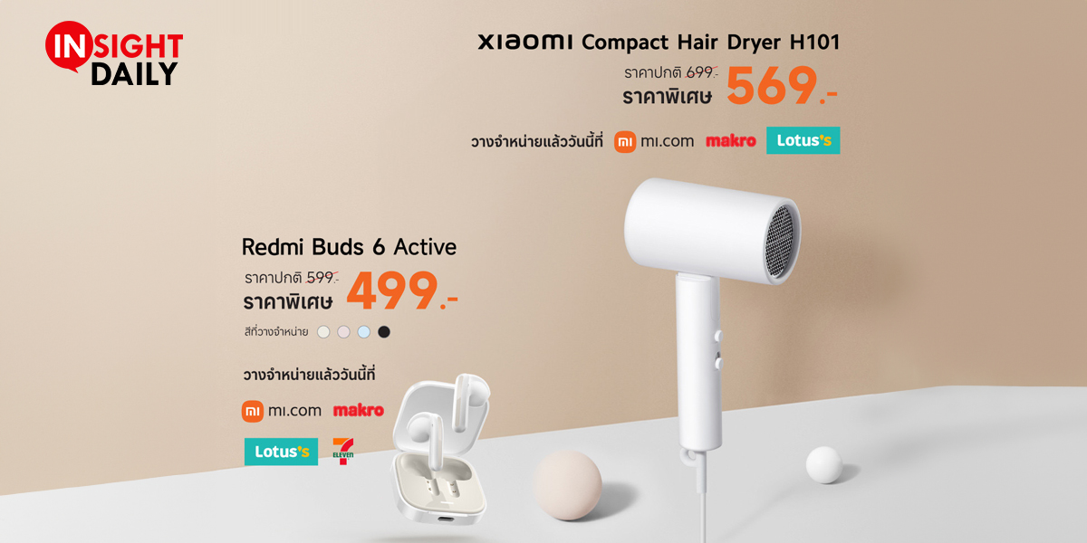 เสียวหมี่วางจำหน่ายหูฟัง Redmi Buds 6 Active และไดร์เป่าผม Xiaomi Compact Hair Dryer H101 อย่างเป็นทางการในประเทศไทย