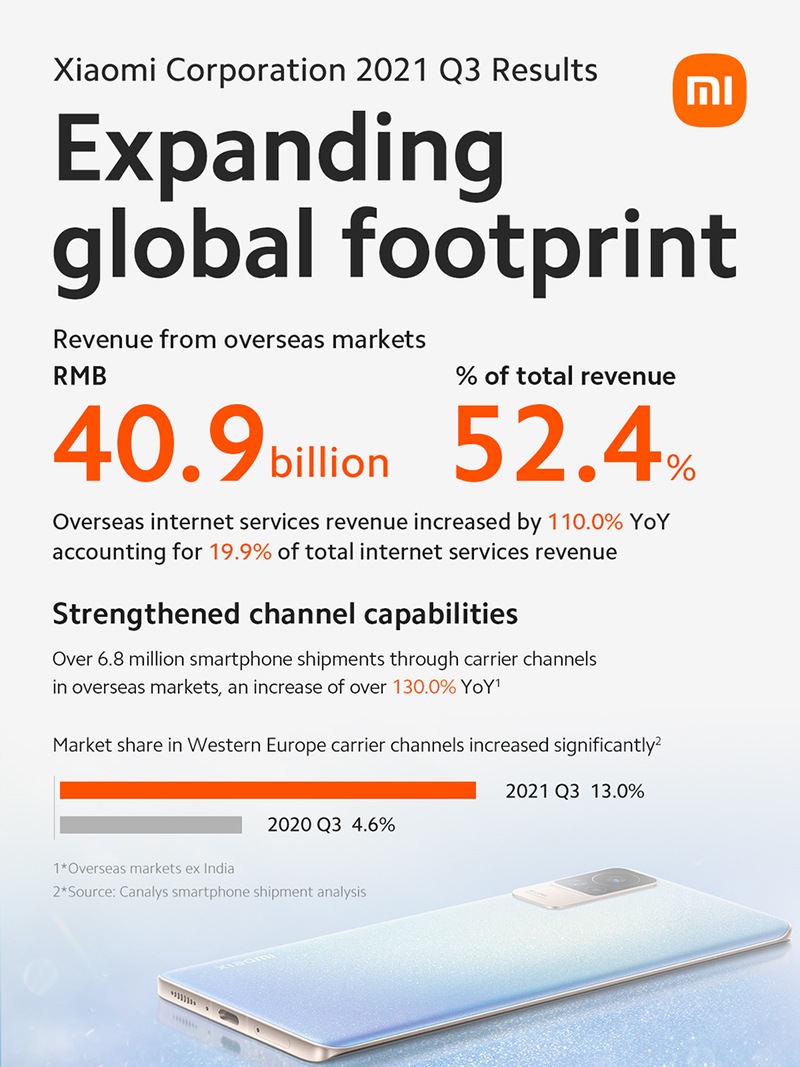 เสียวหมี่ยังคงเดินหน้าสร้างการรับรู้ในตลาดโลกอย่างต่อเนื่องในไตรมาสที่ 3 จากการรายงานของ Canalys ระบุว่า เสียวหมี่เป็นแบรนด์สมาร์ทโฟนอันดับที่ 2 ของยุโรปในไตรมาสที่ 3 ประจำปี 2564 ด้วยส่วนแบ่งการตลาด 21.5% ในภูมิภาคยุโรปตะวันตก สมาร์ทโฟนของเสียวหมี่ได้รับส่วนแบ่งการตลาด 17% และเป็นแบรนด์ 3 อันดับแรกเมื่อคิดจากยอดจัดส่ง สมาร์ทโฟนในภูมิภาคยุโรปกลางและยุโรปตะวันออก เสียวหมี่เป็นแบรนด์สมาร์ทโฟนอันดับที่ 2 ด้วยส่วนแบ่งการตลาด 28.7% ในไตรมาสที่ 3 ประจำปี 2564 เสียวหมี่จำหน่ายสมาร์ทโฟนไปกว่า 6.8 ล้านเครื่องผ่านผู้ให้บริการเครือข่ายในตลาดต่างประเทศ โดยไม่รวมประเทศอินเดีย เติบโตขึ้นกว่า 130% จากปีก่อนหน้า จากการรายงานของ Canalys กล่าวว่า ส่วนแบ่งทางการตลาดของสมาร์ทโฟนเสียวหมี่ในยุโรปตะวันตกผ่านช่องทางผู้ให้บริการเครือข่ายเพิ่มขึ้นจาก 4.6% ในไตรมาสที่ 3 ของปี 2563 สู่ 13% ในไตรมาสที่ 3 ของปี 2564